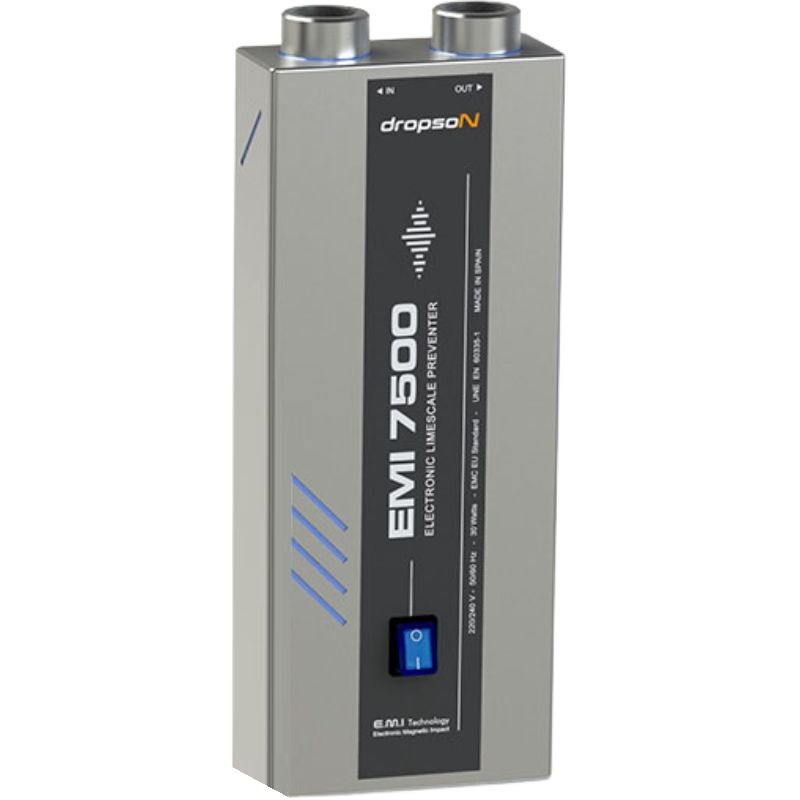 O amaciador de água magnético Dropson EMI 7500, com capacidade de 9 m³/h, possui revestimento e chassis em aço inoxidável com acabamento acetinado. Este amaciador de água eletrónico de última geração opera sem sal, não requer manutenção e elimina o desperdício de água. Está concebido para instalação em fábricas, empresas e residências.