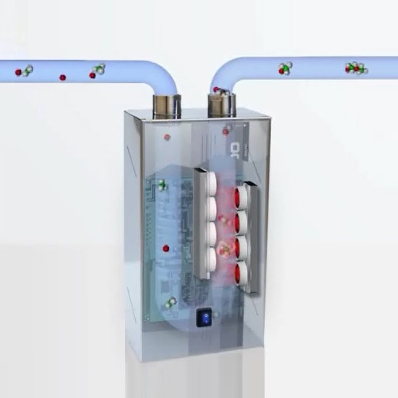 Comparado com os amaciadores de água à base de sal, o Dropson EMI 7500 minimiza os riscos para a saúde e é mais suave para as plantas, uma vez que não contém sódio e não gera resíduos. De facto, não utiliza sal, a principal desvantagem dos amaciadores tradicionais. O sódio libertado pelos amaciadores convencionais à base de sal tem demonstrado estar associado a doenças e apodrecimento das plantas. O novo sistema de tratamento de água residencial Dropson fornece água sem sal, que é menos prejudicial do que os sistemas convencionais e prolonga a vida útil da canalização da sua casa. Além disso, este amaciador de água não altera a composição natural da água e não afeta a sua potabilidade. Entrada de água: Os iões de cálcio (Ca) e carbonato (CO3), responsáveis pela formação de incrustações, ficam suspensos na água. Cristalização: A combinação de impactos magnéticos e da energia cinética do vórtice induz a cristalização dos iões de cálcio e carbonato suspensos na água. O sistema é instalado na entrada principal de água fria e traz um filtro e mangas eletrolíticas, dependendo do material da tubagem.