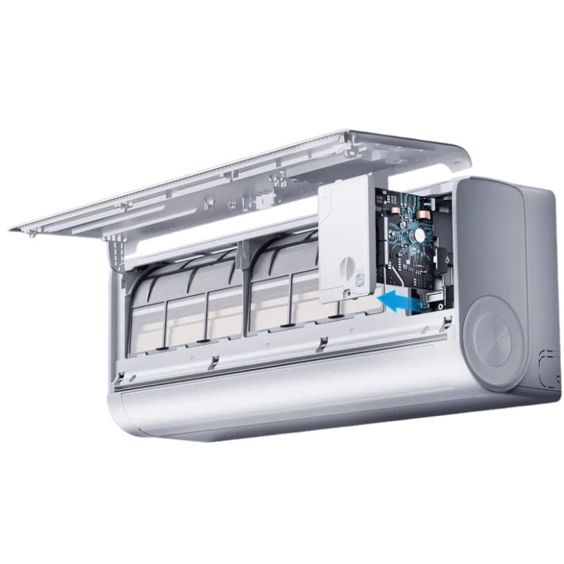 Equipado com um defletor de ar de dupla aleta de ampla amplitude, otimiza o arrefecimento, garantindo que o fluxo de ar potente chega a todos os cantos da divisão. O grande ventilador tangencial de 108 mm de diâmetro proporciona um fluxo de ar potente e de longo alcance para uma experiência de refrigeração excecional. Com autolimpeza a 56 °C, o evaporador é submetido a um processo que inclui a formação de orvalho, a descongelação, a descongelação e a secagem para eliminar as bactérias. Além disso, a função de inversão da unidade exterior remove automaticamente o pó, garantindo um fluxo de ar mais limpo e promovendo uma respiração mais saudável.