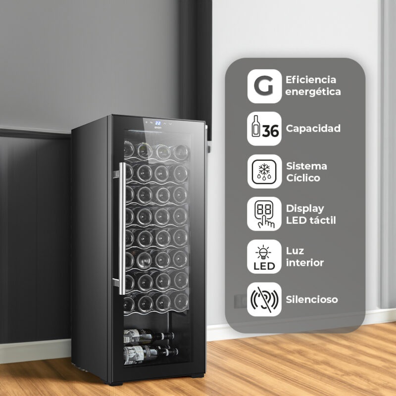 Esta adega climatizada possui refrigeração cíclica, motor universal e utiliza o fluido frigorigénio R600a. Classe energética G e nível máximo de ruído de 41 dB. O seu design preto inclui uma porta de vidro única e fixa com puxador. Oferece uma única zona de temperatura, controlos sensíveis ao toque com visor LED e iluminação interior LED. A capacidade total é de 106 litros ou 36 garrafas, com múltiplos compartimentos para otimizar o armazenamento.