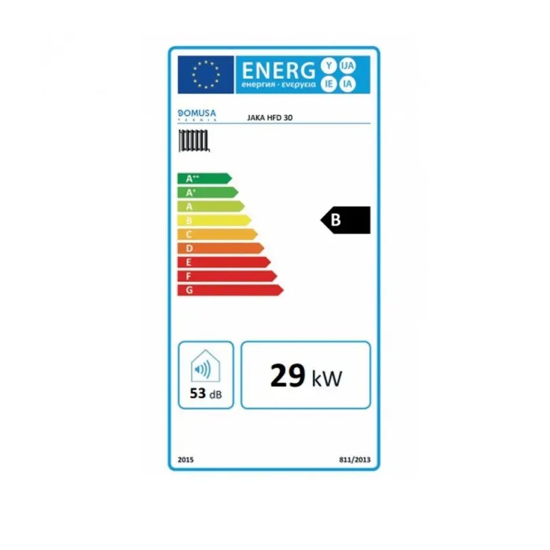 Baixo nível de ruído graças ao seu isolamento, classe de eficiência energética B para aquecimento. Graças ao design do queimador, as caldeiras Jaka HFD podem ser instaladas com uma chaminé de 80 mm sem isolamento. Podem também ser instaladas com secções horizontais, poupando custos de instalação. Potência: 27,8 kW.