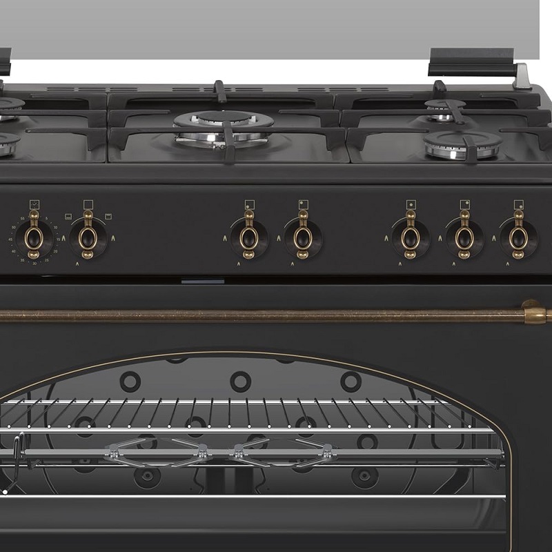 O fogão a gás tem cinco queimadores e um queimador wok de três chamas. Inclui comandos mecânicos, uma bancada esmaltada e grelhas em ferro fundido.