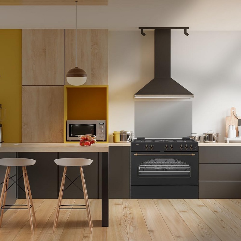 O seu design rústico preto é realçado por uma tampa de vidro articulada e um sistema de controlo manual com ignição automática.
