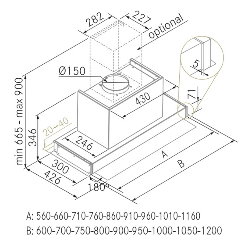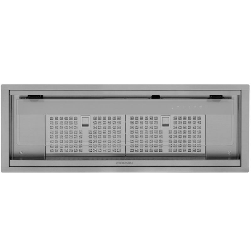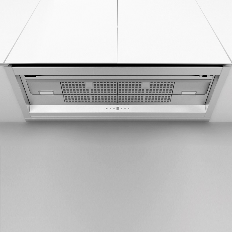 A campânula integrada Frecan Note, fabricada inteiramente em aço inoxidável, está totalmente embutida sob os armários, permanecendo completamente invisível. Graças à sua viseira retrátil, este modelo permite a extração perimetral (com a viseira fechada) ou a extração tradicional (com a viseira aberta), sendo esta última ideal para uma melhor extração quando utilizada com as bocas frontais da zona de confeção.