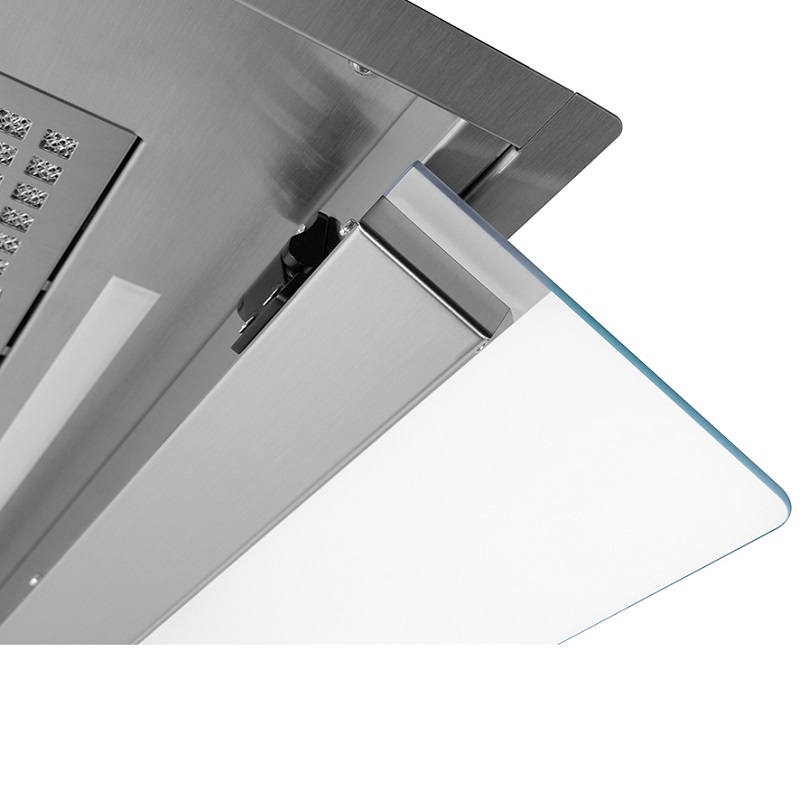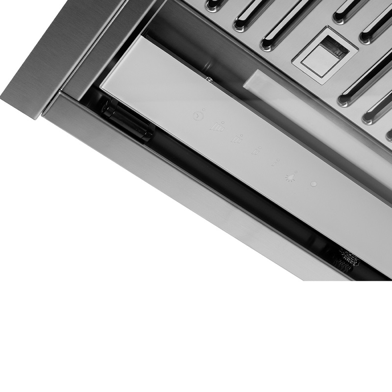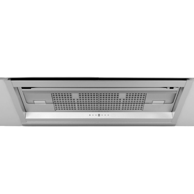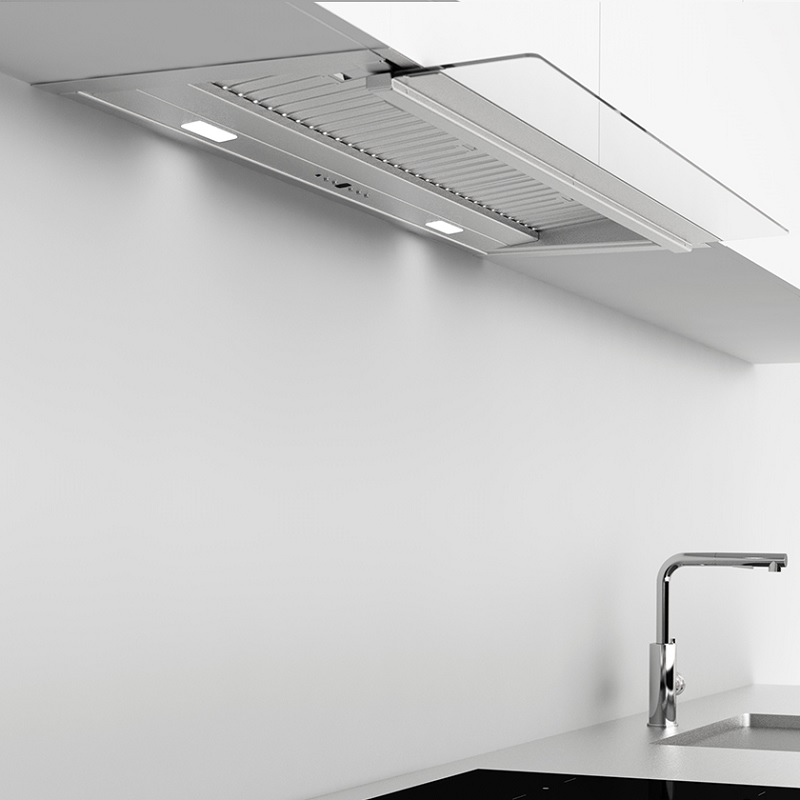 A campânula integrada Frecan Note, fabricada inteiramente em aço inoxidável, está totalmente embutida sob os armários, permanecendo completamente invisível. Graças à sua viseira retrátil, este modelo permite a extração perimetral (com a viseira fechada) ou a extração tradicional (com a viseira aberta), sendo esta última ideal para uma melhor extração quando utilizada com as bocas frontais da zona de confeção.