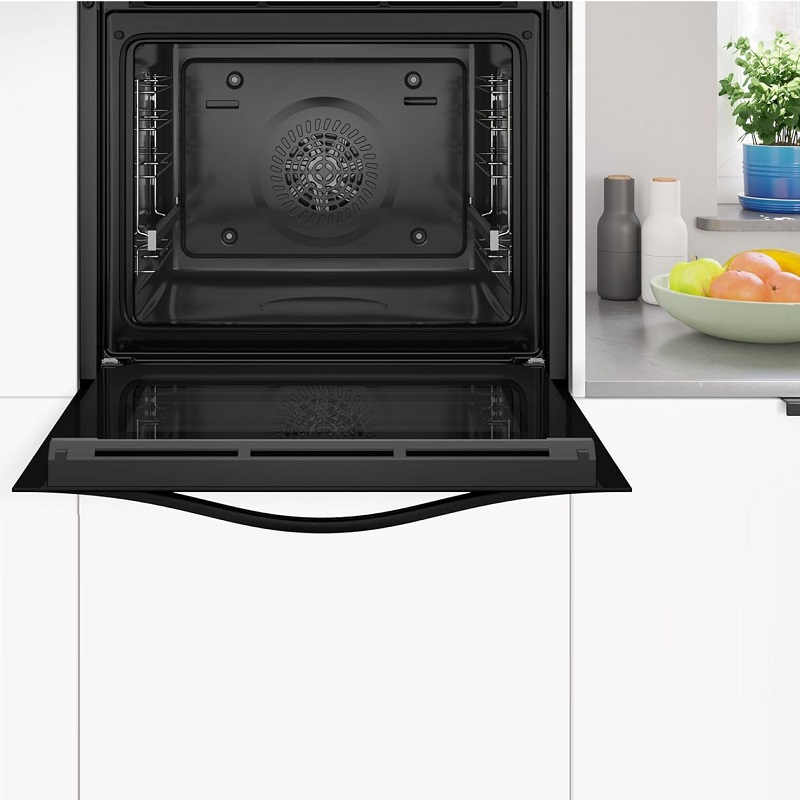 Cozedura uniforme com convecção assistida por ventilador numa capacidade de 71 litros, facilitando a preparação de vários pratos e controlando o consumo de energia. Este eletrodoméstico embutido encaixa num nicho padrão graças às suas dimensões compactas. A classificação energética A+, com 0,69 kWh/ano no modo de convecção assistida por ventilador, ajuda a limitar os custos diários de energia. O carril telescópico simplifica o manuseamento de pratos quentes, proporcionando um acesso seguro a todos os níveis de cozedura. O painel frontal branco complementa diversos estilos de cozinha. A porta basculante facilita o carregamento de contentores de grandes dimensões. O fecho de segurança infantil ajuda a evitar aberturas e fechos acidentais durante o uso.