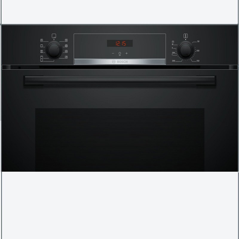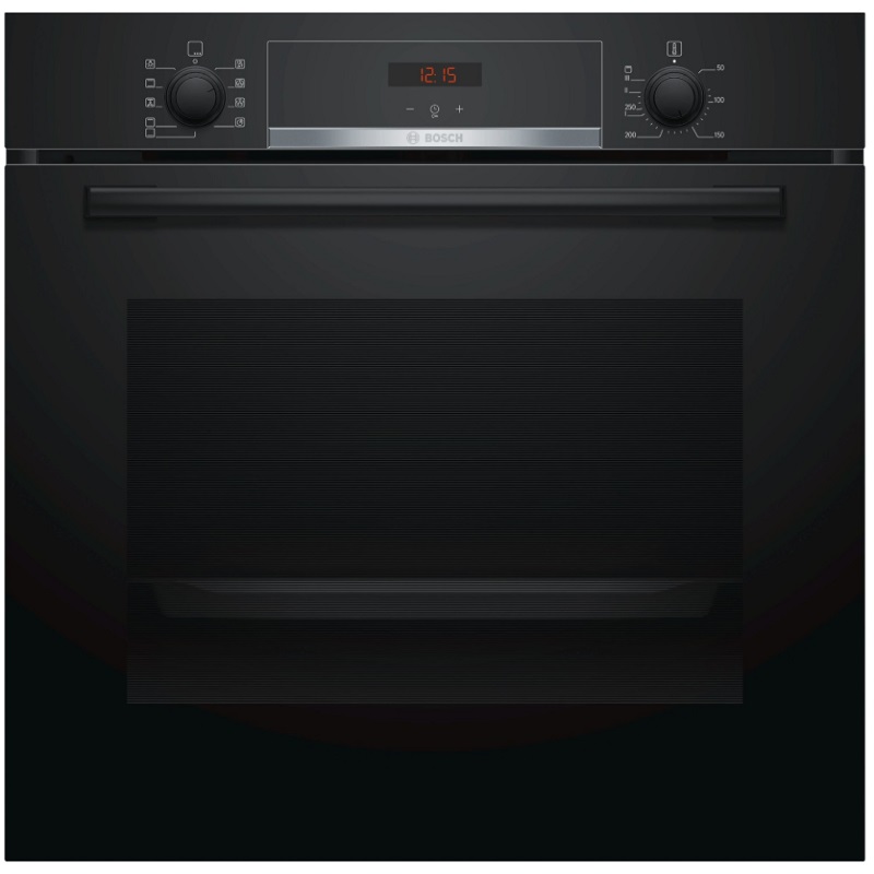 Forno Bosch Série 4 HBA534BB0. Tamanho do forno: Médio, Tipo de forno: Forno elétrico, Capacidade interna total: 71 L. Tipo de instalação: Encastrado, Cor: Preto, Tipo de controlo: Rotativo e sensível ao toque. Tipo de relógio: Eletrónico, Tipo de temporizador: Digital. Classe de eficiência energética: A, Consumo de energia (aquecimento convencional): 0,97 kWh, Consumo de energia (ventilador): 0,81 kWh