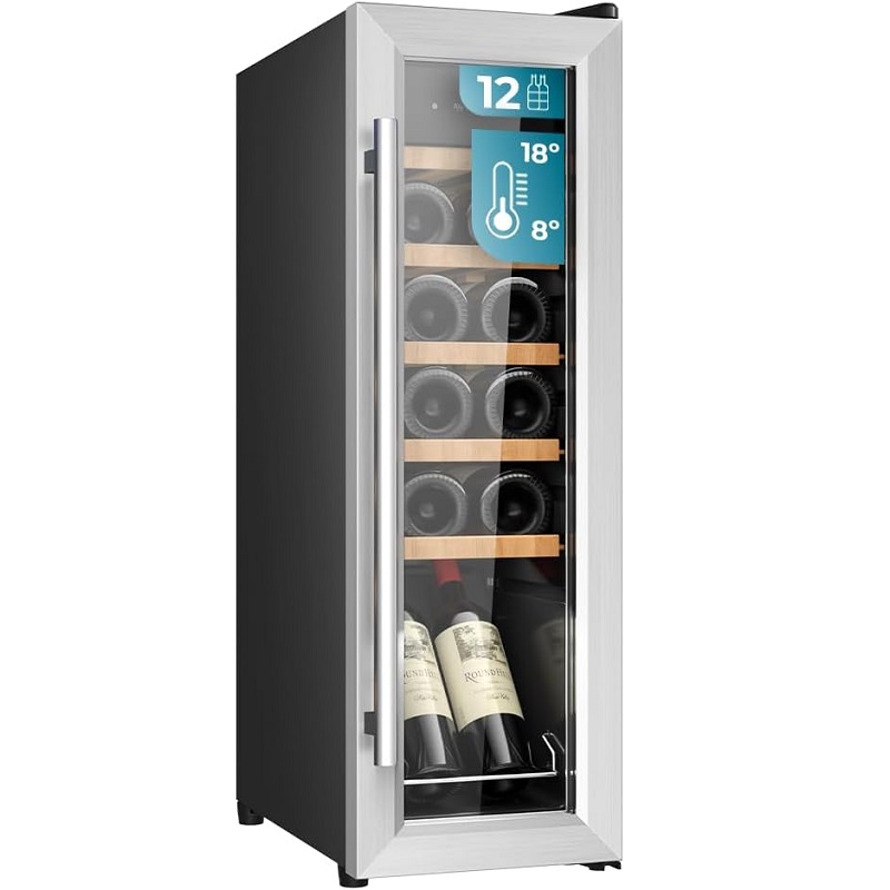 Garrafeira independente com capacidade para 12 garrafas, temperatura regulável de 8 a 18 °C, 25 cm de largura e 79,5 cm de altura, prateleiras em madeira, ecrã táctil e iluminação LED interior.