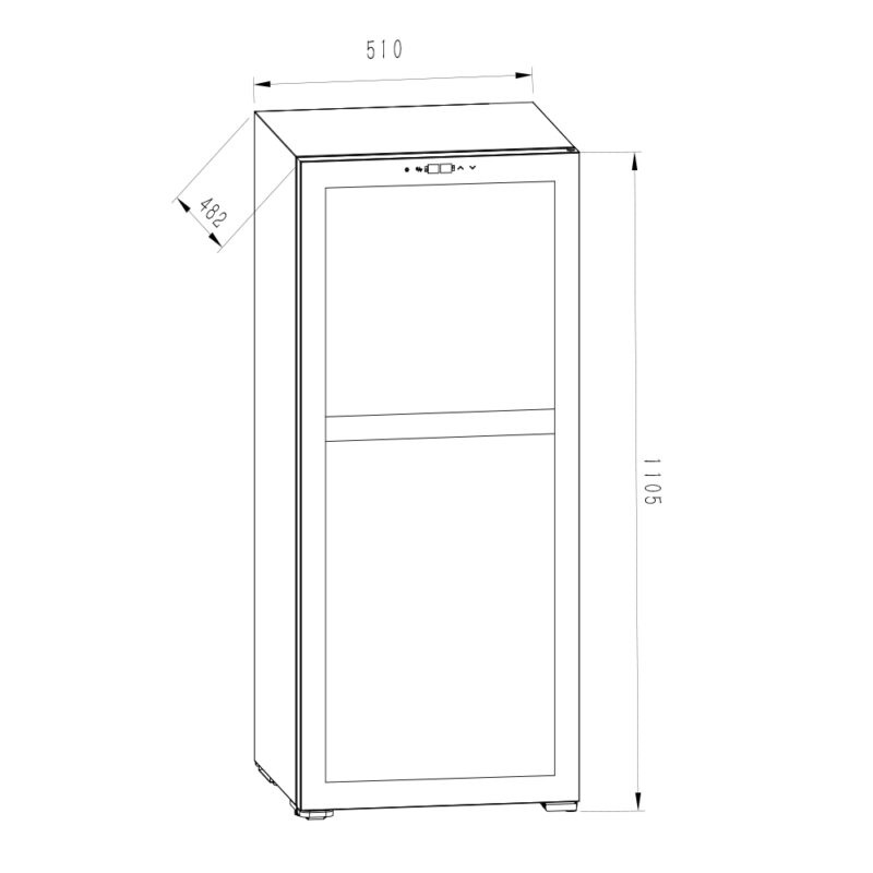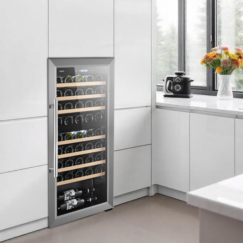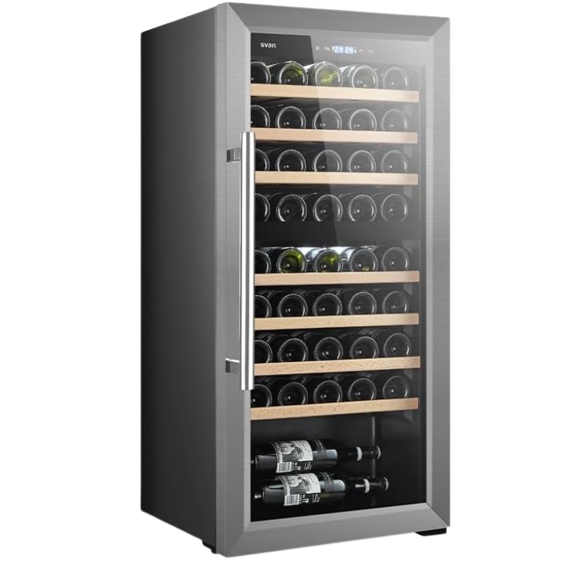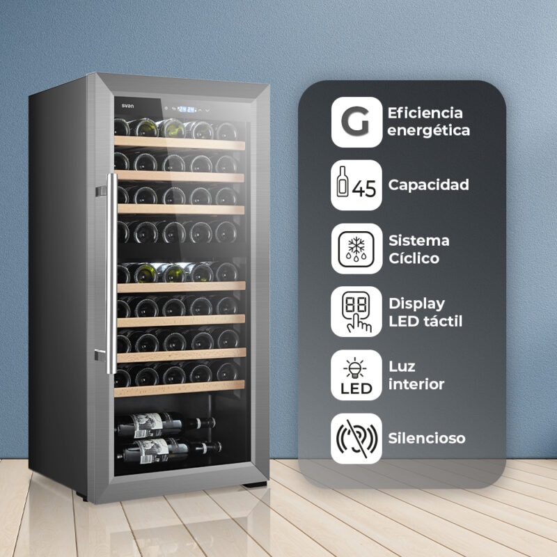 Esta adega climatizada possui refrigeração cíclica, motor universal e utiliza o fluido frigorigénio R600a. Classe energética G e nível máximo de ruído de 43 dB. O seu design preto inclui uma porta de vidro única e fixa com puxador embutido. Oferece duas zonas de temperatura, controlos sensíveis ao toque com display LED e iluminação interior LED. A capacidade total é de 127 litros ou 45 garrafas, com múltiplos compartimentos para otimizar o armazenamento.