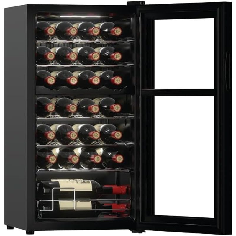 O seu sistema de refrigeração por compressor garante um arrefecimento rápido e estável, permitindo a regulação da temperatura entre os 5 e os 18°C, dependendo do tipo de vinho: branco, rosé, tinto ou espumante. O controlo preciso da temperatura é feito através de um painel de controlo sensível ao toque com visor digital, que também oferece a opção de exibir a temperatura em °C ou °F, de acordo com a sua preferência. O seu design inclui uma grande janela que permite visualizar o interior da adega sem abrir a porta, ajudando assim a manter uma temperatura constante. Esta janela possui isolamento térmico duplo, uma grande vantagem para evitar flutuações de temperatura e proteger o vinho da luz e do calor exteriores.