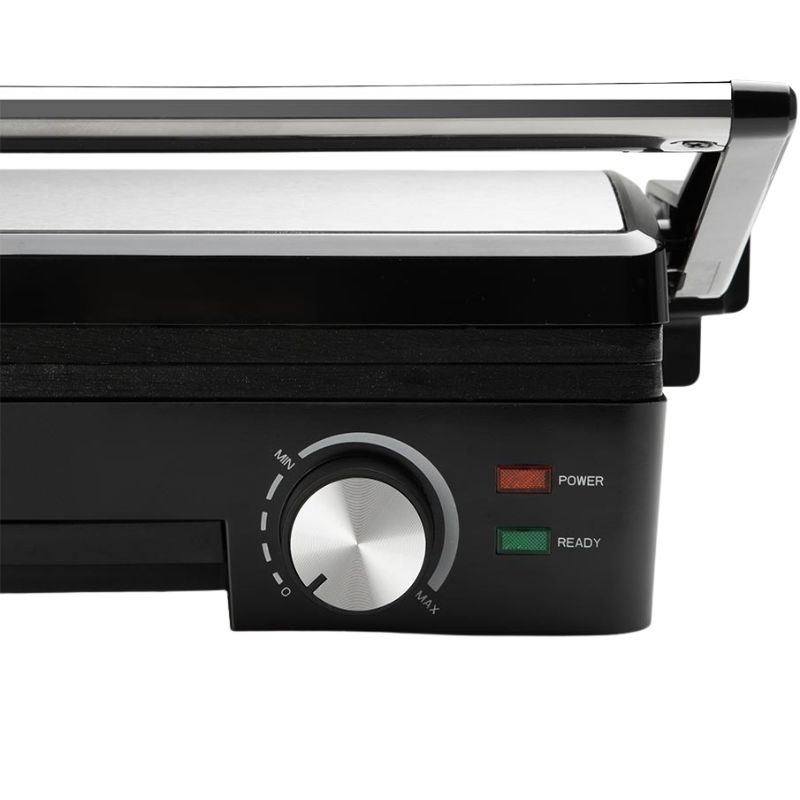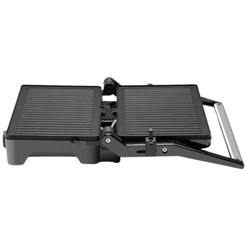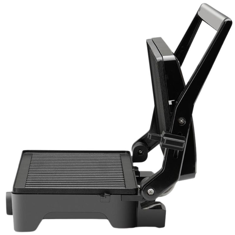 Uma das suas principais vantagens é a ampla superfície de cozedura com duas placas dobráveis ​​de 180°. Pode usá-la como uma grelha tradicional fechada para uma cozedura uniforme em ambos os lados (ideal para sanduíches ou bifes) ou abri-la completamente para dobrar a superfície de cozedura e usá-la como chapa. Perfeita para preparar várias porções de uma só vez ou para grelhar grandes cortes de carne.