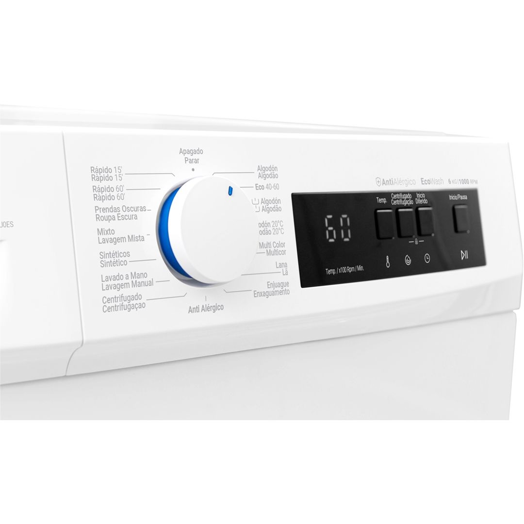 Com a sua capacidade de 6 kg, esta máquina de lavar roupa é ideal para famílias pequenas e médias. Pode lavar uma carga completa de roupa num único ciclo, poupando tempo e energia.