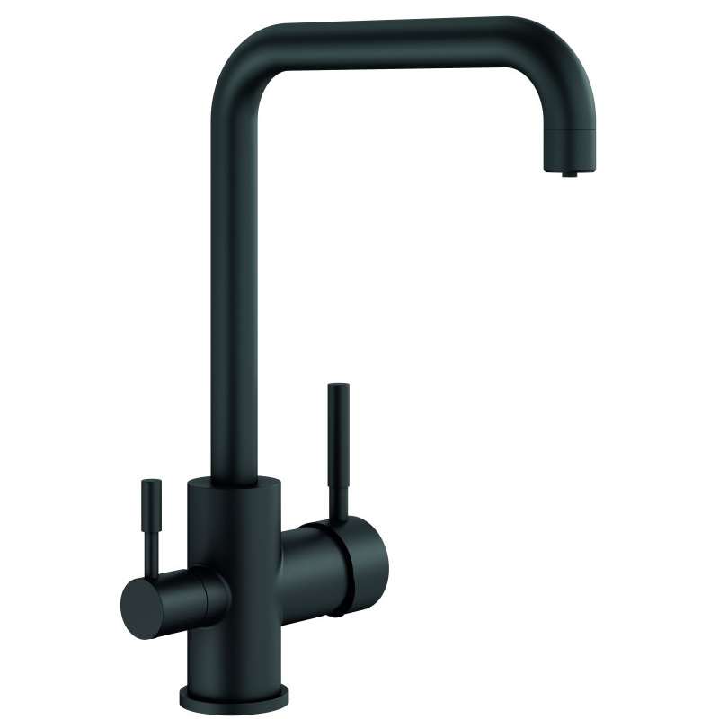 Torneira de cozinha monocomando de 3 vias para instalação em bancada, em conformidade com as normas UNE 19703 e NF XP P 41-280. Acabamento preto mate de alta qualidade, mangueiras de ligação fáceis de instalar incluídas. Equipada com o sistema GE COLD-START para poupança de água e energia, abre sempre com água fria, resultando numa poupança significativa de energia ao evitar o funcionamento desnecessário da sua caldeira, esquentador ou esquentador elétrico. Sistema duplo de água numa única torneira: um bocal de dupla função permite a utilização simultânea de água filtrada e água da rede sem mistura.