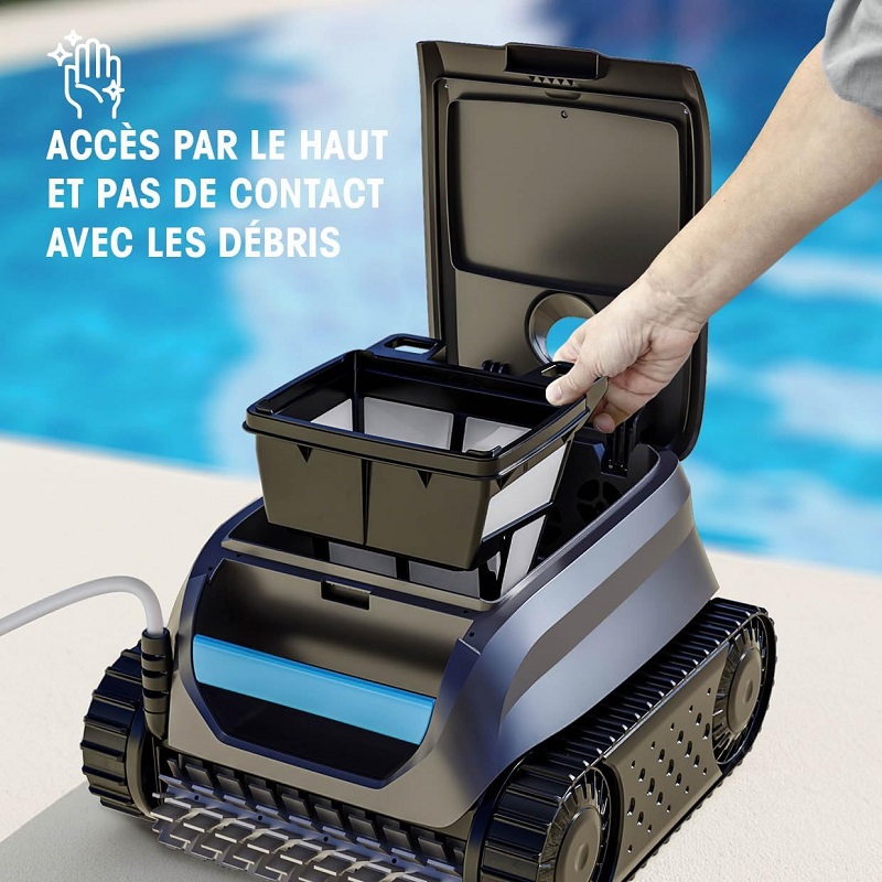 Graças à sua sucção ciclónica, uma patente exclusiva da Zodiac, o SWY 3500 destaca-se na sua função de limpeza: isto garante uma potência de sucção constante durante todo o ciclo, permitindo ao robot limpar meticulosamente o fundo, os lados e a linha de água, capturando as impurezas de forma muito eficaz. O SWY 3500 distingue-se pela facilidade de utilização. O seu filtro de 3 litros, localizado na parte superior do robot, é facilmente removível para uma limpeza rápida com água, eliminando a necessidade de manusear a sujidade diretamente.