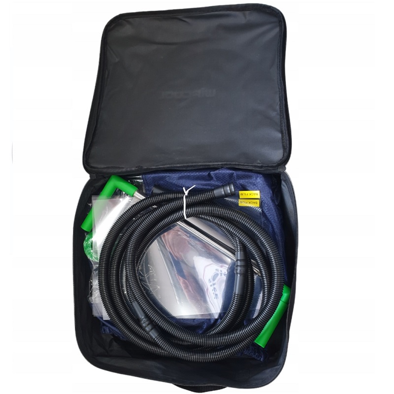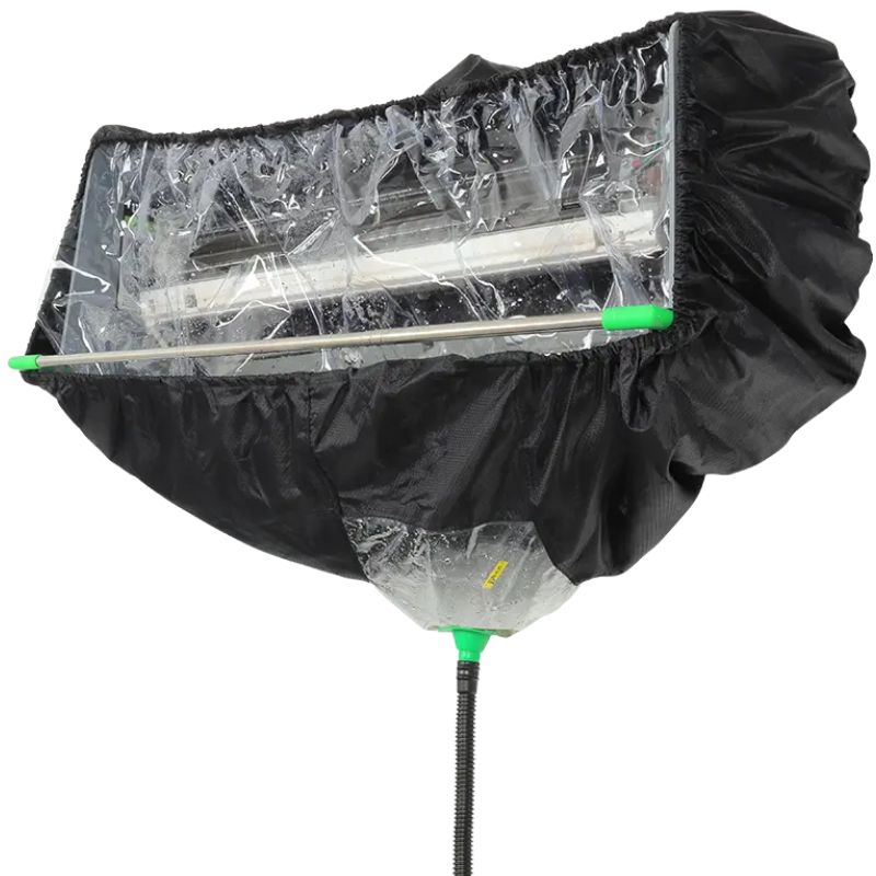 Isto facilita a manutenção de um ambiente de trabalho limpo e seguro. O saco adapta-se perfeitamente ao formato da unidade a limpar, e a mangueira na parte frontal, juntamente com o painel frontal transparente, permite um fácil acesso ao bocal da pistola de pulverização. Isto permite chegar a todos os cantos do ar condicionado sem abrir o saco.