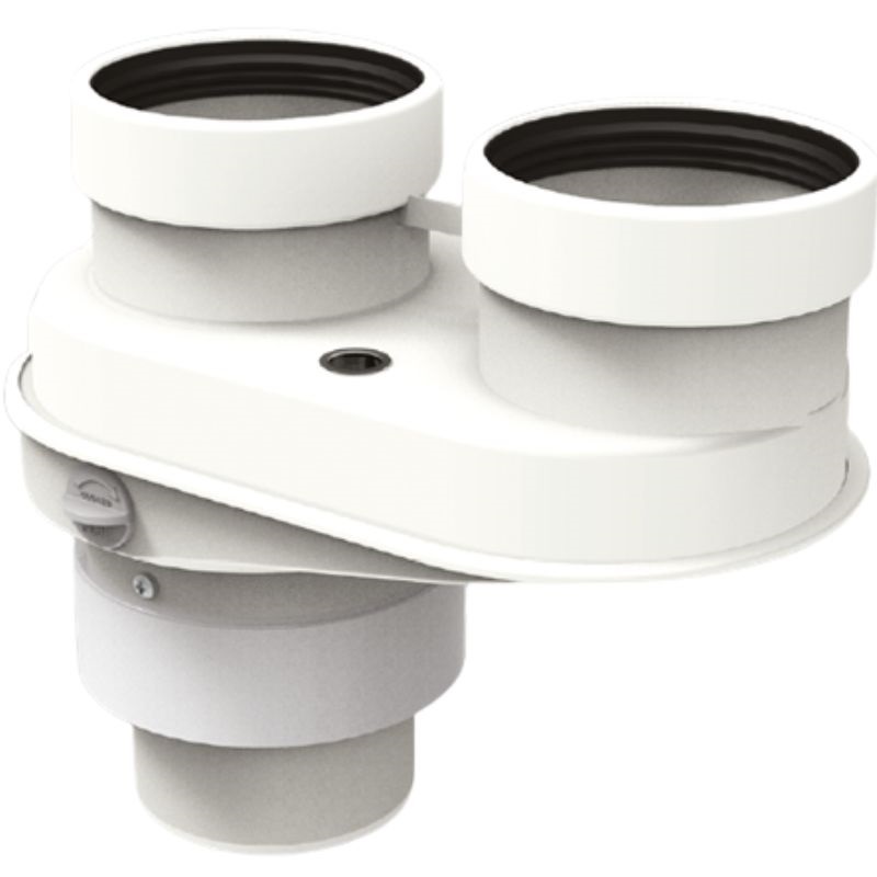 Adaptador coaxial para saídas de caldeiras de fluxo duplo, compatível com caldeiras ACV e Intergas, fabricado em polipropileno e aço lacado.