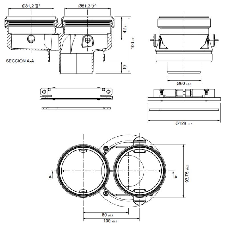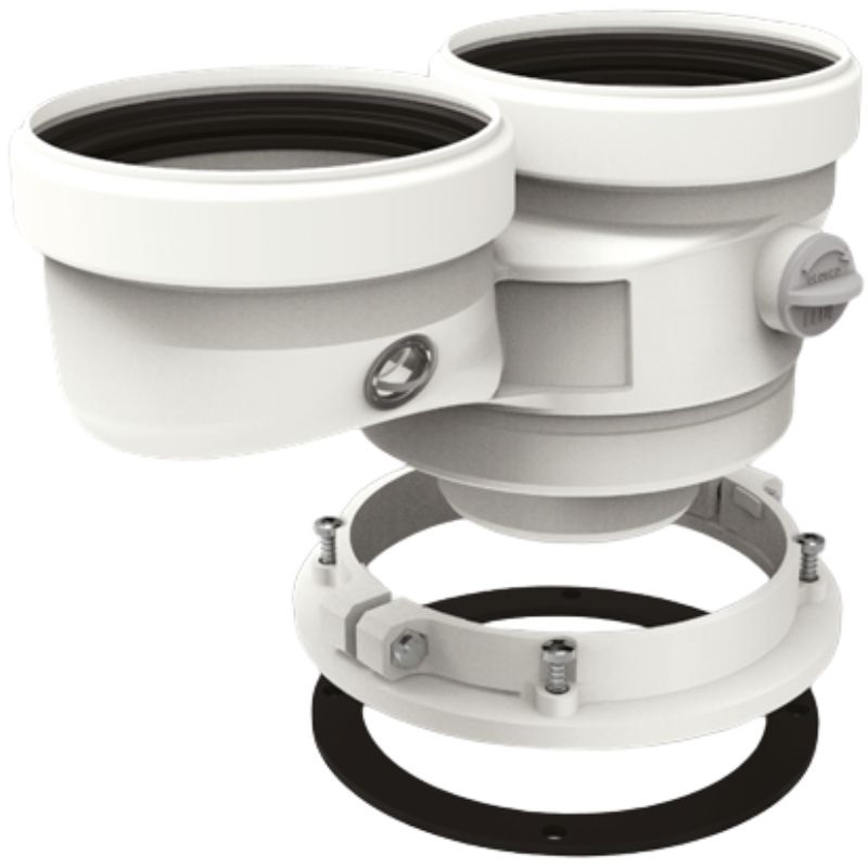 Adaptador coaxial para saídas de caldeiras de caudal duplo, compatível com as caldeiras Domusa, Fondital e Wolf. Fabricado em polipropileno com juntas. Possui entradas de ar e gases de combustão em cada lado.